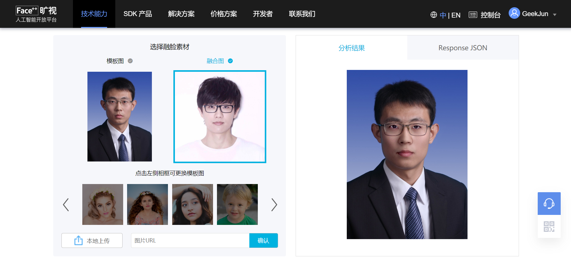 | 优势 | 人脸融合场景多样,开发文档详细,调用权限较少,不需获取 access_token ,代码实现有 python 等轻量级语言 | 人脸融合高清磨合,不会很相似也不会失真很厉害 | 未开放 |