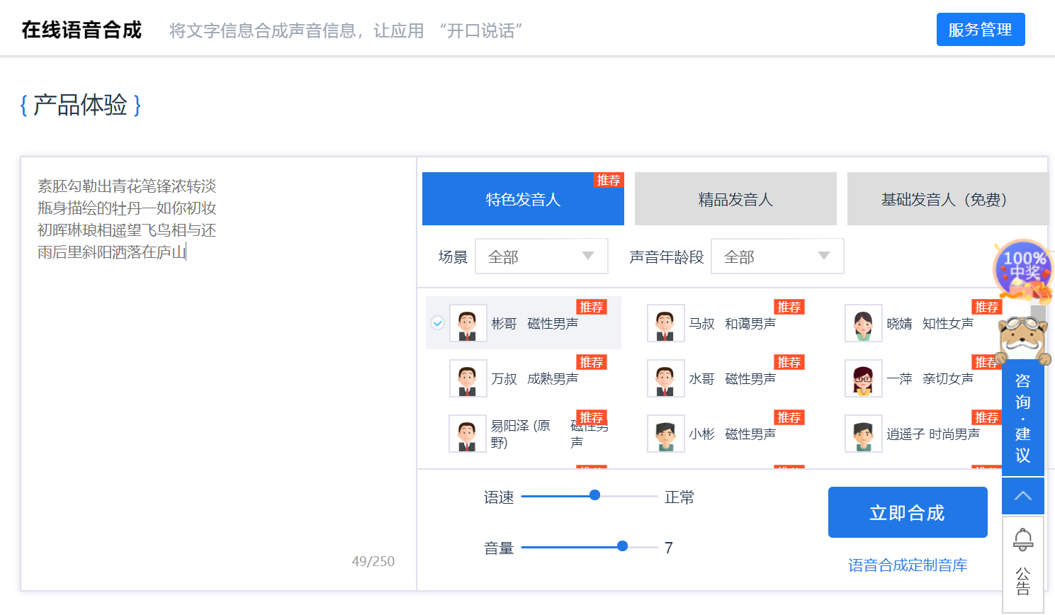 | 劣势 | 250词限制,找不到文档就是按照上课流程来进行代码的调用 | 200字限制,很着急直接念完没有停顿,2男声2女声 | 50字限制,在代码层次上语音合成只有PHP的代码没有pythn代码,官方压根没有合成示例文档,全自己摸索,SDK 都开发出来了,示例代码给一下能死,怪不得没人用。在合成效果上讲,声音难听爆了,语音文件还得解码再 I/O, 吃饱了撑的,怪不得没人用,百度语音合成效果比你强多了 | 未开放网页端,只有微信小程序体验版 网易 AI 体验中心,限制50字,语速只有正常慢速快速之分,没有API可以调用,没有文档 |
