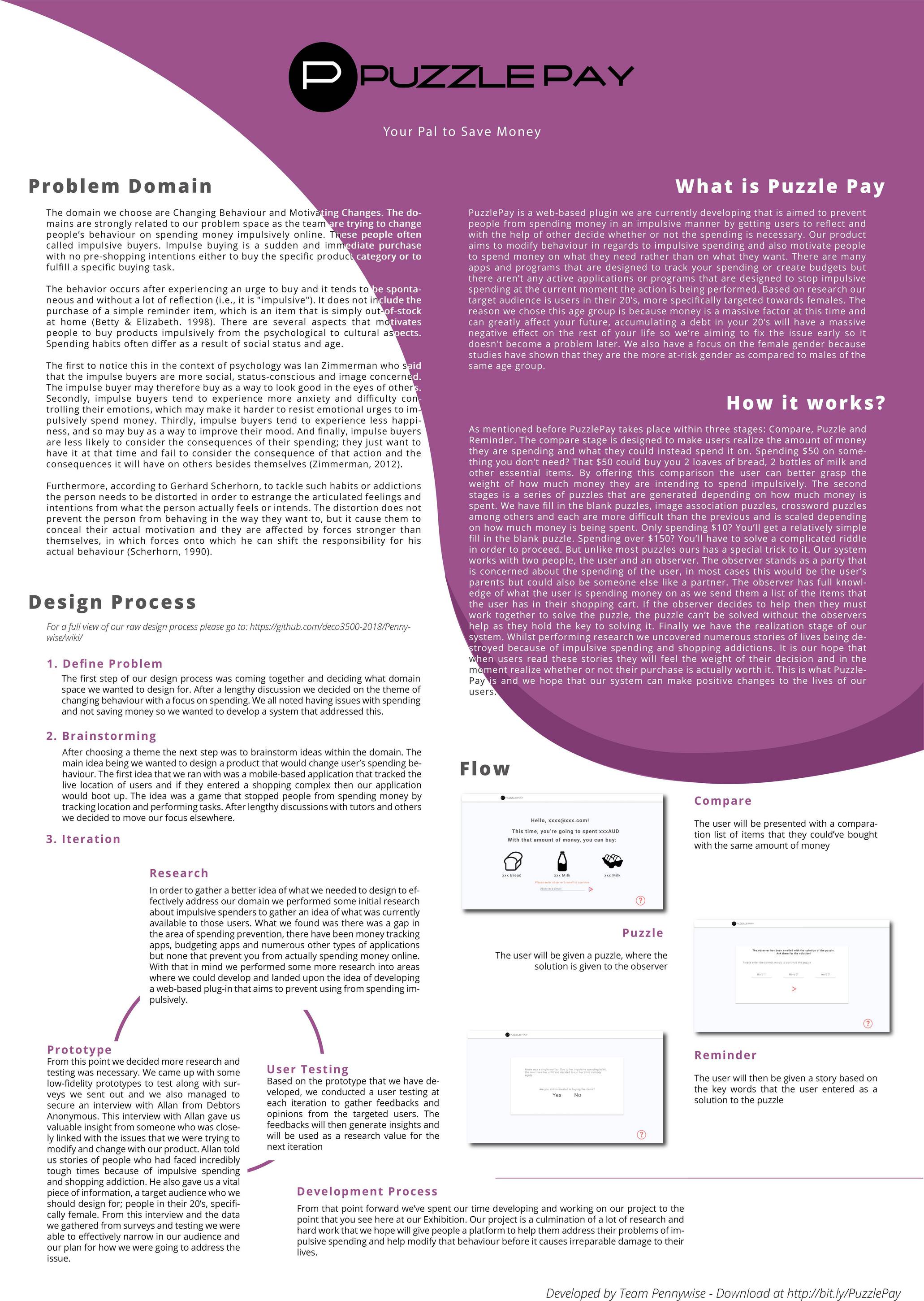 We implemented the insights that have been generated from the user testings that we have conducted in the development of Puzzle Pay. Our project is a culmination of research and hard work that we hope would be able to help people address their problem of impulsive spending and help them change their behaviour before it caused unwanted and irrepairable damage to their life. Click the link below to see the dedicated WIKI page to our development process.