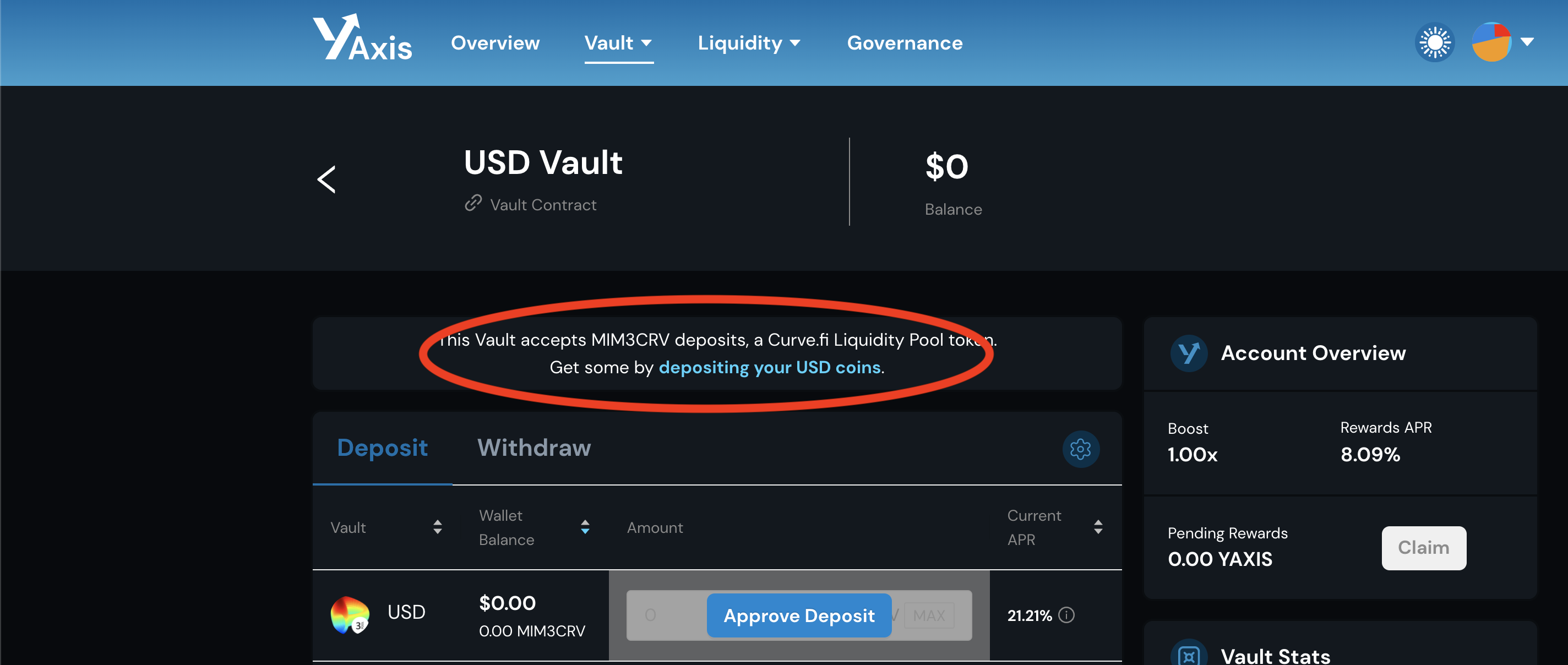 Currently this area of the Vault details page (e.g. https://app.yaxis.io/vault/usd) gives a link that takes a user to Curve.fi's website (e.g. https://curve.fi/mim/deposit)