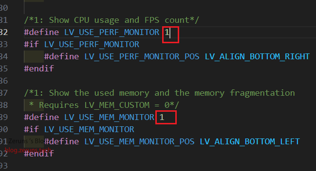 如果需要关闭帧率和内存占用显示就将 lv_conf.h 文件里的下面这两个宏定义的1改成0。